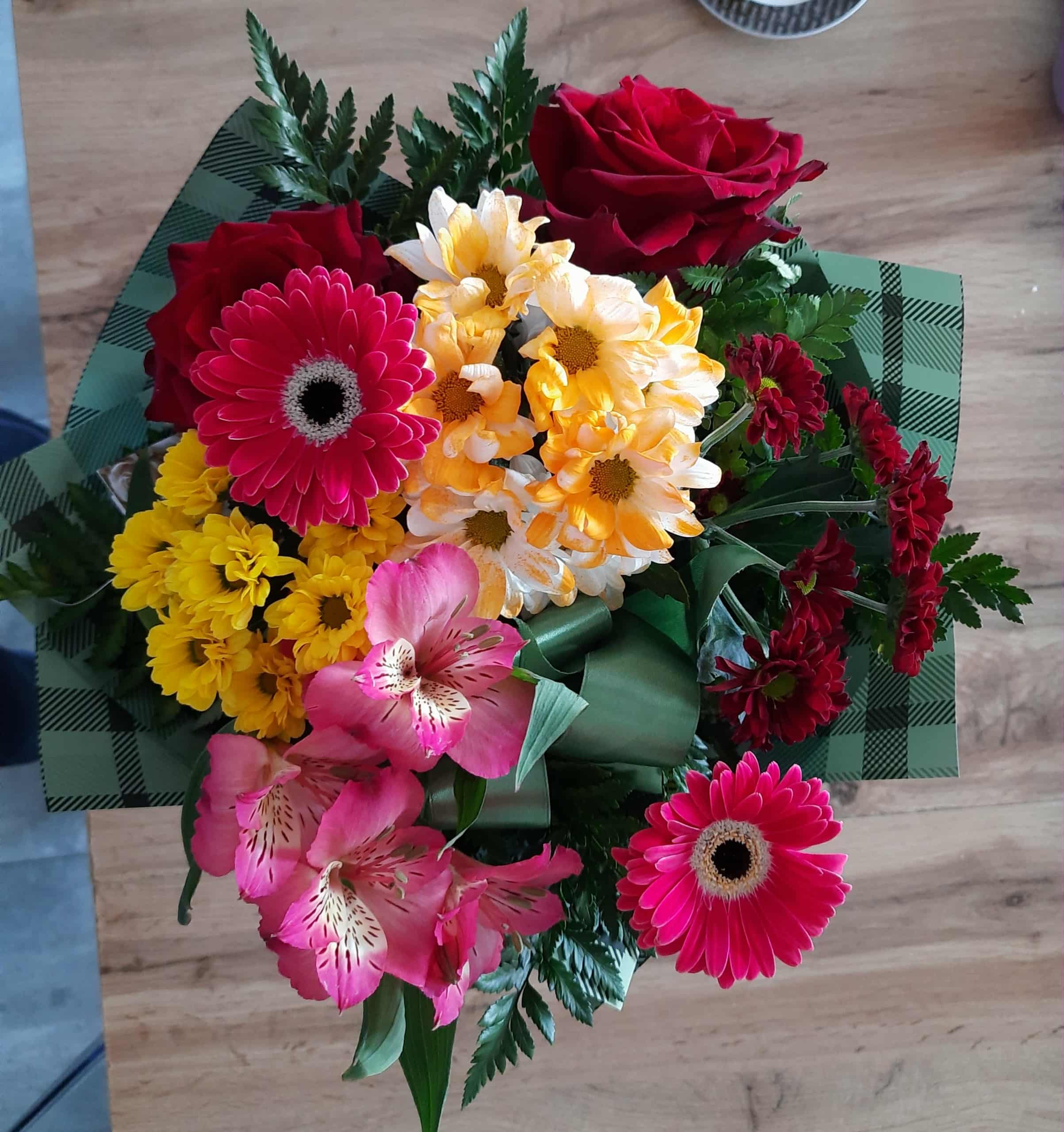 Zawsze świeże kwiaty Kwiaty na jesień to wprowadzenie do pomieszczeń typowych dla tej pory roku kolorów. Łączenie ich w kompozycję sprawia, że zarówno róże, goździki, jak i gerbery będą wyglądały wyjątkowo. Barwy na jesień prezentują się idealnie. Do bukietu istnieje opcja dołączenia bileciku. Bukiet w wersji: