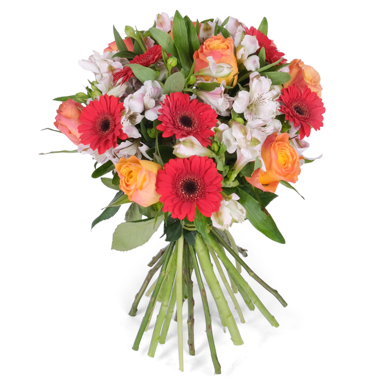 Eleganckie róże spotykają wyraziste gerbery i delikatne alstromerie. Kompozycja łącząca siłę z finezją. Bukiet emanujący kobiecością i naturalnym pięknem. Doskonały wybór na szczególną okazję. Możesz dodać liścik lub wysłać kwiaty anonimowo.